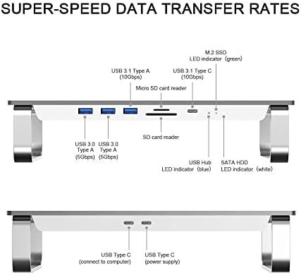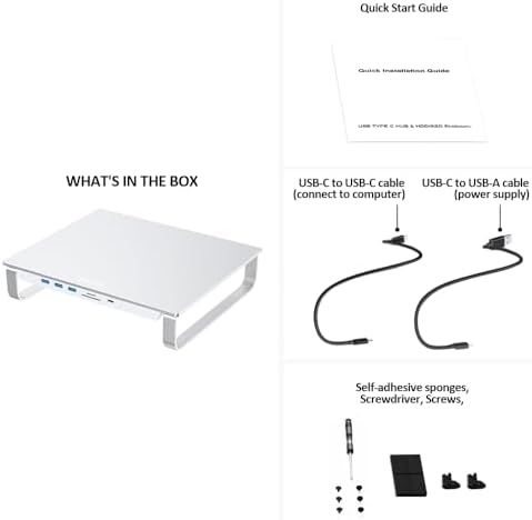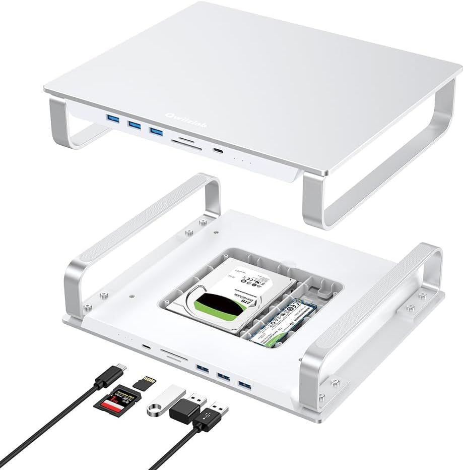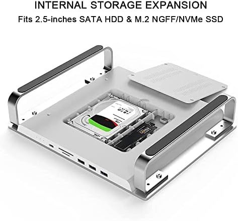 \"\nINTERNAL STORAGE EXPANSION - supports M.2 SSD with NVMe PCIe Gen3x1(one lane) and NGFF/SATA protocols, supports 2.5-inch SATA SSD and SATA HDD below 9.5mm thickness, expands storage for Mac. This product itself does not include any Mac, HDD or SSD.\nSUPER-SPEED DOCKING STATION - features USB 3.2 Type-C port up to 10Gbps, USB 3.0 Type-A port up to 10Gbps, USB 3.0 Type-A port up to 5Gbps and Micro/SD card readers up to 100MB/s for quick access to essential peripherals.\nCOMPACT USER-FRIENDLY DESIGN - adds it to Mac Studio or Mac Mini with a sleek enclosure made of aluminum alloy, user-friendly installation for M.2 SSD and 2.5-inch SSD/HDD.\nCOMPREHENSIVE COMPATIBILITY - supports Mac Mini (2018 Intel, 2020 M1, 2023 M2/M2 Pro) and Mac Studio (2022 M1 Max/M1 Ultra, 2023 M2 Max/M2 Ultra).\nCOMPLETE ACCESSORY LIST - includes self-adhesive sponges to ensure an optimal fit for SSD/HDD installation, quick start guide for users, USB-C to USB-C cable for connecting to computer, USB-C to USB-A cable for connecting to external power supply when using M.2 SSD and SATA SSD in the same time.\"