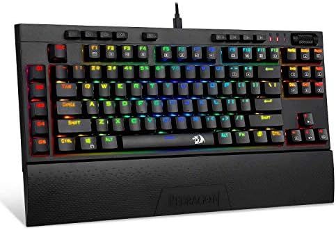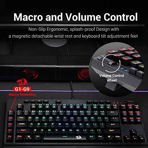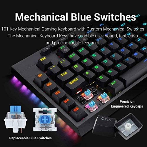 COMPACT TENKEYLESS GAMING KEYBOARD; 101 Key Mechanical Gaming Keyboard with Custom Mechanical Blue Switches. The Mechanical Keyboard Keys have audible click sound, fast, crisp and precise tactile feedback. WITHOUT separate number gaming keypad\nDYNAMIC RGB BACKLIGHTING for all keys and Immersive Side Edge Illumination. molded keycaps offering crystal clear uniform backlighting and lettering that doesn\\\'t scratch off. 18 Backlight plus 12 Side Edge Backlight Modes, 8 different colors, 5 backlight brightness levels, breathing speed, and user defined backlighting\nMACRO RECORDING & VOLUME CONTROL; The keyboard comes with 9 Programmable MACRO keys and 12 dedicated Multi Media keys and Volume Control Scroll Wheel which allows you to adjust your Audio without interrupting your Game\nERGONOMIC DESIGN WITH DETACHABLE PALM REST; Non-Slip Ergonomic, splash-proof Design with a magnetic detachable wrist rest and keyboard tilt adjustment feet. Comes with 6 foot long detachable USB-C Cable. All 101 mechanical keys are conflict free (n-Key Rollover) for ultimate Gaming performance\nPC GAMING KEYBOARD COMPATIBILITY: Microsoft Windows 10, Windows 8, Windows 7, Windows Vista, or Windows XP, Limited Apple Mac OS keyboard support. Works well with all major Computers Brands and Gaming PCs.