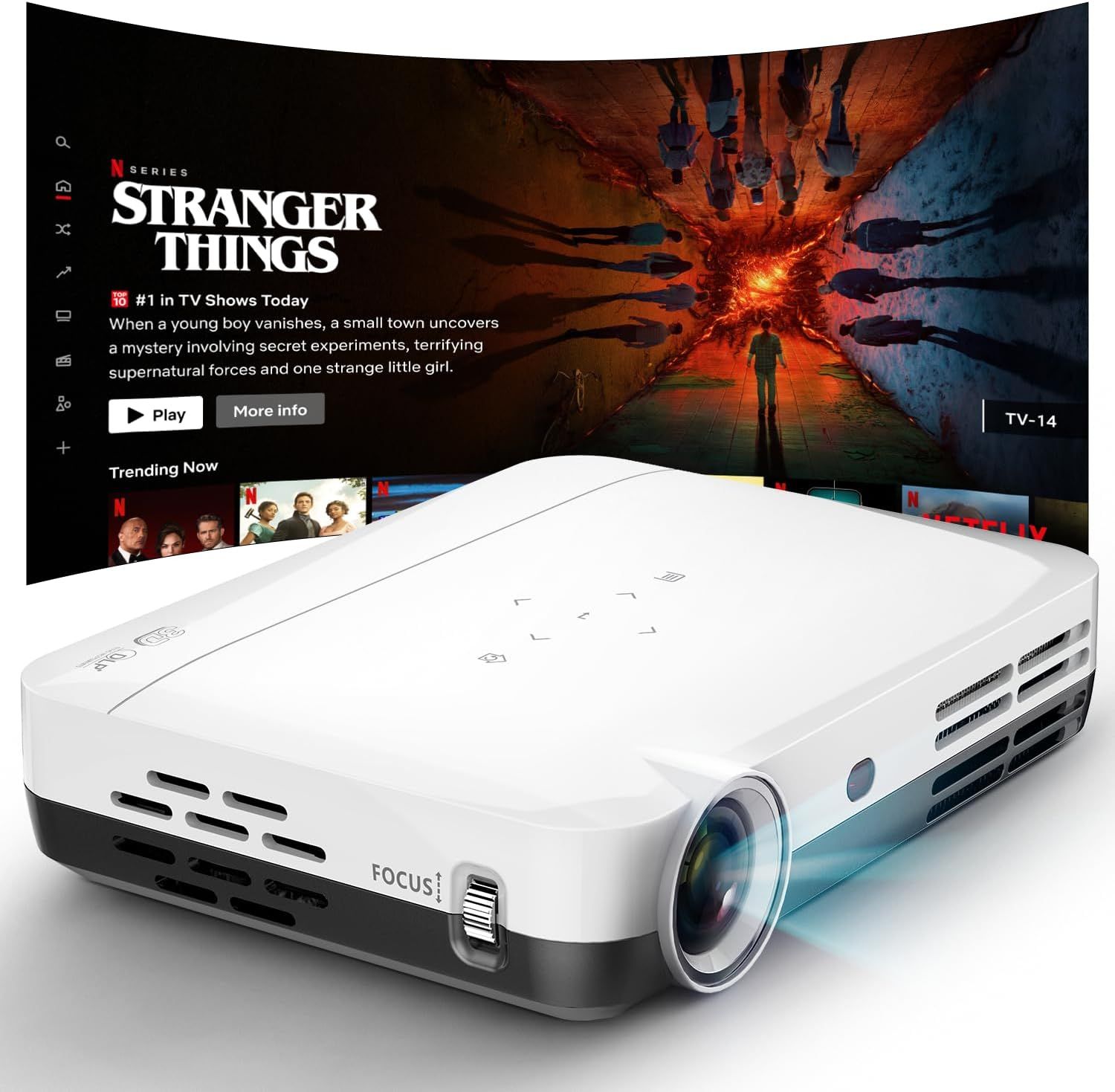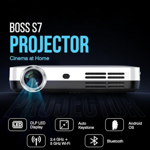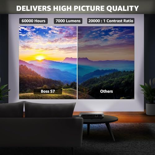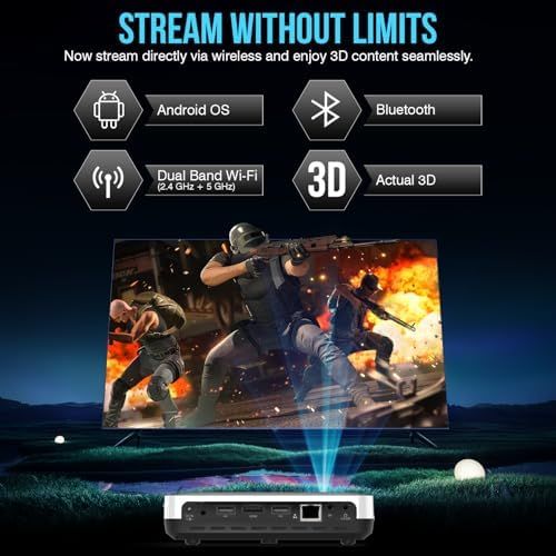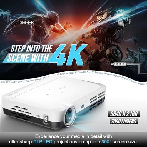 \"\nSMART 3D TECHNOLOGY SUPPORT: The small projector enhance your environment that feels like a home theater projector. Access your favorite apps and games directly with our wireless projector for a smooth streaming experience. Appreciate immersive 3D visuals with this video projector that transforms any space into a mini-theater.\n7000 LUMENS FOR LIGHTING CONDITIONS: This smart projector has 7000 lumens that ensure crystal-clear images whether you are watching on a bluetooth projector in a well-lit room or complete darkness. Experience pure joy with vibrant colors, sharp details, and perfect brightness whether watching movies day or night, this projector ensures every scene comes to life with crystal-clear clarity.\n4K ULTRA HD RESOLUTION: Our outdoor projector is ideal for both home theaters and professional setups. Enjoy breathtaking 3840x2160 pixels clarity with this 4k projector and lifelike detail with true 4K resolution. This mini projector delivers a vibrant and immersive viewing experience for movies, games, and presentations on a projector screen.\n300 INCH DISPLAY AND 4D KEYSTONE: Our bedroom projector is perfect for creating a cozy atmosphere in your room while you view the movie. The 4D keystone correction ensures the picture is aligned so you can enjoy clear images no matter where you are. Transform your room into a movie theater vibe with our mini projector featuring a 300-inch display.\nENDURING PERFORMANCE WITH VERSATILE COMPATIBILITY: This night light projector boasts a remarkable 60000-hour lamp life for long-lasting enjoyment. The smart projector also offers wide compatibility, allowing you to connect with TV sticks, gaming consoles, HDMI, USB-enabled devices, and smartphones.\"