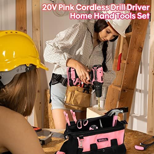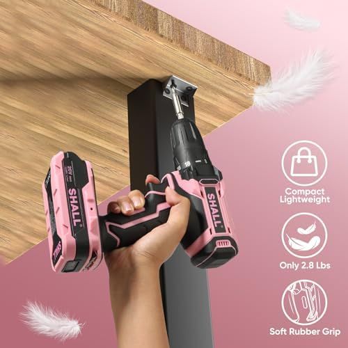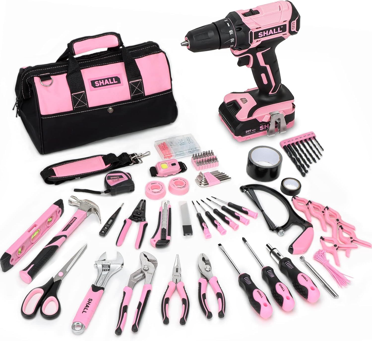 ✅ [18+1 Position Clutch] - The 18 torque of the cordless drill allows for various screwing applications and an additional 1 torque for drilling wood/metal/plastic. Multi-position clutch provides precise control of drilling to prevent screws from sinking too deep, falling off screw heads or even breaking screw shafts.\n✅ [20 Voltage & 266 In-lbs Max Torque] - This 20V high voltage cordless drill driver will provide up to 266 In-lbs (30N.m Max) torque rotation strength to overcome resistance.\n✅ [2 Variable Speeds] - Featuring a 2-variable-speed switch (0-350 and 0-1350 RPM), combined with an adjustable clutch gives you the versatility to drill different materials and use a variety of bits. Low speed for screwing and high speed for drilling.\n✅ [Household Hand Tools & 14” Pink Storage Bag] - The home tool set comes with many hand tools including slip joint pliers, groove joint pliers, adjustable wrench, long nose pliers, magnetic screwdriver holder, screwdriver bits, utility knife, tape measure, etc. The 14\\\" Pink women\\\'s tool bag is great for home improvement and DIY projects.\n✅ [3/8” Keyless Chuck] - The 3/8\\\" keyless chuck allows the cordless drill to use a variety of bits for common tasks around the house. With the Forward/Reverse switch you can install/remove the bits by hand tightening or loosening the chuck.\n✅ [2.0AH Batteries & 1.5H Fast Charger] - The 20V 2000mAh higher-capacity Li-Ion battery with battery indicator has long-lasting performance to keep it going. The 1.5A fast charger keeps electric drill fully charged in 1.5 hour and keeps running continuously.\n✅ [LED Work Light & Ergonomic Handle] - LED Light for increased visibility in enclosed workspaces and dark environment. Lightweight design at only 2.8 lbs with non-slip rubber handle for greater comfort.\nShow More