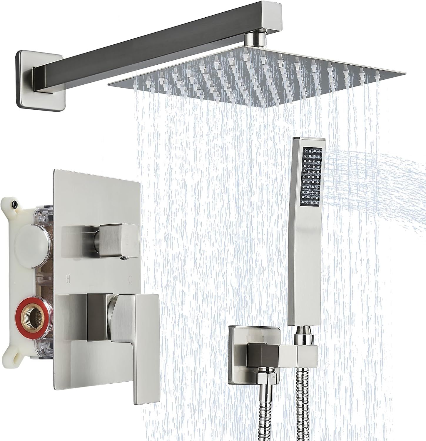 Rain Shower System with Handheld Spray: 8 Inch Square Rain Shower Head(304 stainless steel), Handheld Spray(Brass), 14.5 inches Shower Arm(Brass), 1.5 m Shower Hose(304 stainless steel),Shower Holder(Brass), Water Control Valve(Brass).