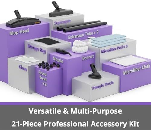 [Versatility]: Handheld steamer comes with 21 basic accessories, allowing for easy and eco-friendly completion of cleaning tasks. It can be used on various surfaces, from hard floors and glass to furniture and even clothing. They are designed to handle hard-to-reach areas and can be used to clean everything from interior decorations to kitchen utensils