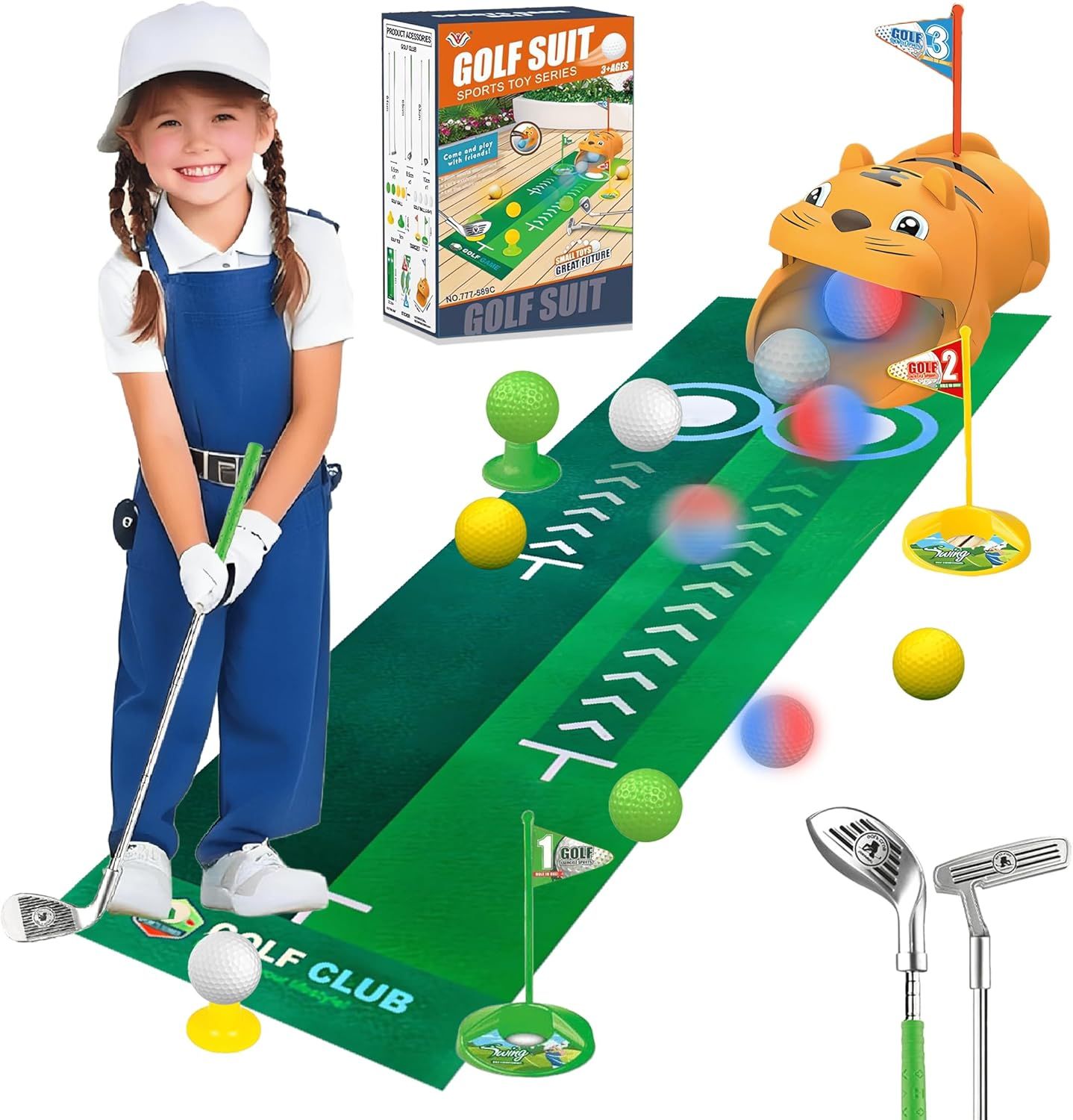 đăComplete Indoor & Outdoor Sports SetăThis 16-piece toddler golf set includes everything young golfers need: automatic ball returner, putting mat, 3 adjustable-length clubs, 8 colorful balls (including 4 LED glow balls), golf tees, flags, and fun stickers. Perfect for the backyard, park, living room, or playroom â ready for fun anywhere.