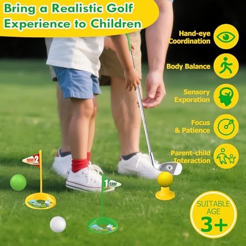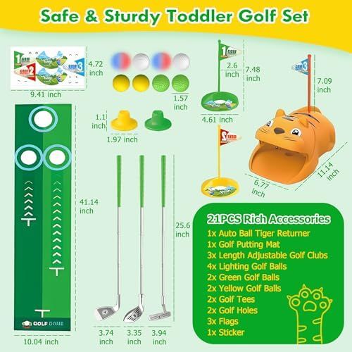 âłăGlow-in-the-Dark Real Golf ExperienceăPlay day or night with 4 glow-in-the-dark LED golf balls that flash on impact, creating a colorful arc thatâs fun to watch and easy to find. Includes 3 adjustable toddler golf clubs (wood, iron, putter) designed to mimic real golf angles for a more authentic swing as kids grow. Note: Not suitable for left-handed players.