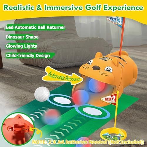 đăAuto Ball Return for Nonstop FunăNo more chasing balls. The built-in automatic ball return system keeps the game moving â kids simply aim for the tigerâs mouth and watch the ball roll right back. This engaging golf yard game keeps children focused and active. Note: Requires 2 AA batteries (not included).