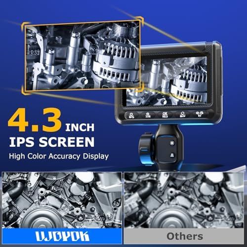 4.3-Inch IPS Screen, UJOYOK Boerescope with AI chip improved smooth & clear video with 2nd generation CMOS sensor, Automatically adjust contrast according to different lighting environments. No App Require! astonishing borescope suitable for any inspection like engine cylinder, balbes, pipes, etc.