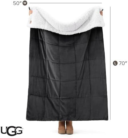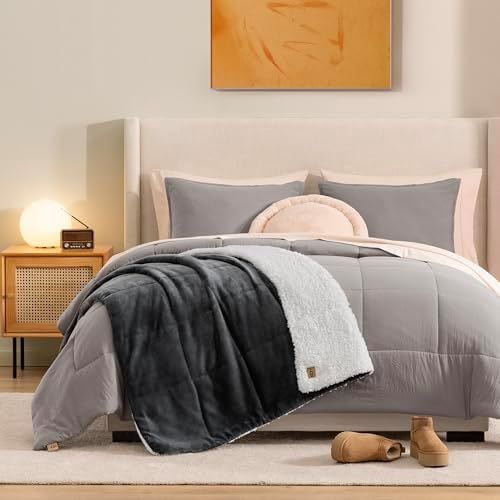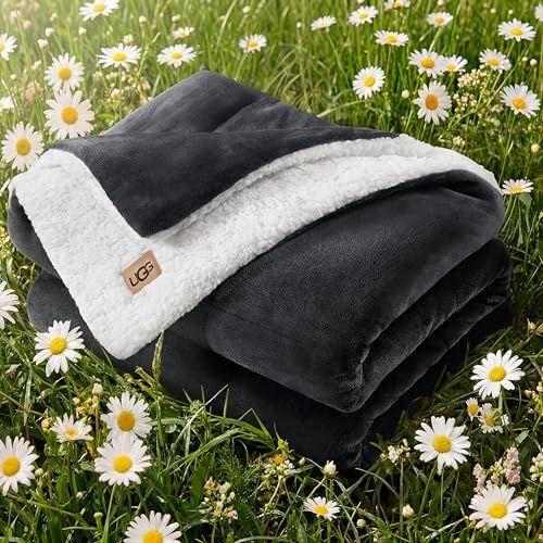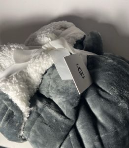 Grey Fluffy Throw Blanket: This reversible throw features box stitching on one side and white plush UGG Fluff on the other, delivering a soft and warm blanket feel. The medium-weight blanket adds a stylish touch to bedroom or living room decor.