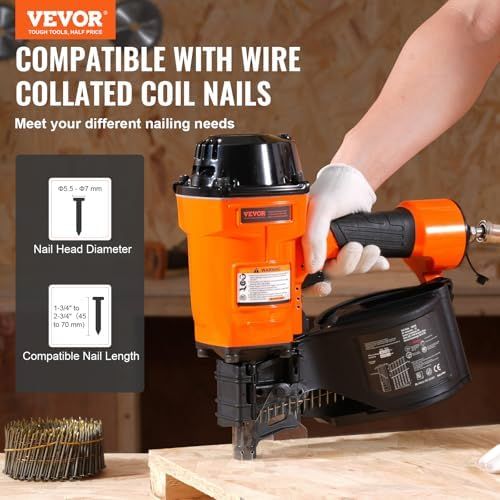 Outstanding Performance: VEVOR MCN70 pneumatic coil nailer is compatible with wire-collated coil nails, accommodating lengths from 1-3/4 to 2-3/4 inches and head diameters from Φ5.5 to Φ7 mm. It is ideal for assembling pallets, wooden boxes, fencing, crating, and general construction tasks like siding, decking, and sheathing. (Compatible Shank Diameter: Min 2.3 mm - Max 2.9 mm)
