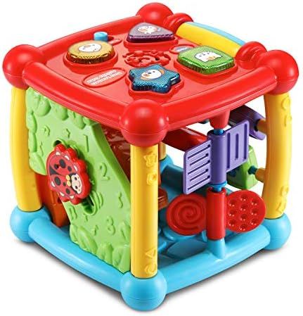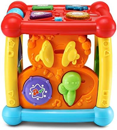 Kids learning toy has 5 sides of play that encourage discovery and exploration; 4 light-up buttons introduce animal names, animal sounds and shapes Pre-k learning toy has 14 interactive features that develop fine motor skills; toy assists babies with sitting up to play Motion sensor activates fun sounds when the activity cube is moved to attract attention and encourage crawling Early learning center has 25 playful songs and melodies that keep toddlers engaged and entertained Block toy is designed for 6 month to 3 year olds; made of BPA-free plastic and has adjustable volume, auto shut-off; 2 AAA batteries are included for demo, use new batteries for regular use }