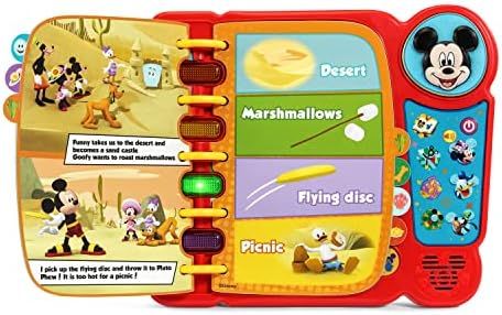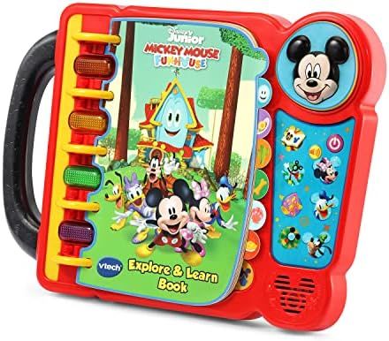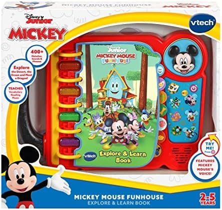 Discover new places with Disney\\\'s Mickey Mouse, Funny the Funhouse and friends; 14 pages tell a story and introduce new vocabulary\nPress the Mickey Mouse button to hear his real voice, and the Minnie Mouse, Donald Duck and Goofy buttons to hear him talk about his friends\nRead along with the story and press the light-up buttons to interact with the pages in Story, Explore, Music and Search modes\nChunky carrying handle lets kids easily take the story on the go\nIntended for ages 2-5 years; requires 3 AA batteries; batteries included for demo purposes only; new batteries recommended for regular use\nFeaturing a delightful story, this interactive book for kids makes a perfect holiday gift or birthday present and includes a carrying handle for taking it on the go