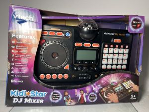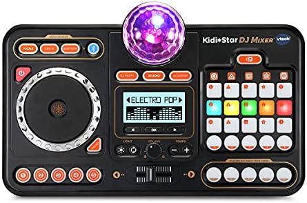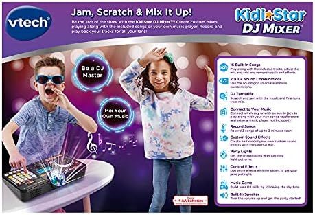 Mix and jam with a DJ turntable, 15 built-in songs and 2000+ sound combinations Create custom sound effects to mix onto songs, then save your music samples and add light effects for a dazzling DJ party Connect to your music playlist via BLUETOOTH wireless technology or audio cable; play your mash-ups through the built-in speaker or plug in headphones (music player, audio cable and headphones not included) Fine tune your DJ talent by playing along with a built-in music game Intended for ages 5+ years; requires 4 AA batteries; batteries included for demo purposes only; new batteries recommended for regular use Entertain friends and family with a DJ mixing station featuring tons of sound and light effects; makes an awesome birthday present or holiday gift for kids ages 5+ years