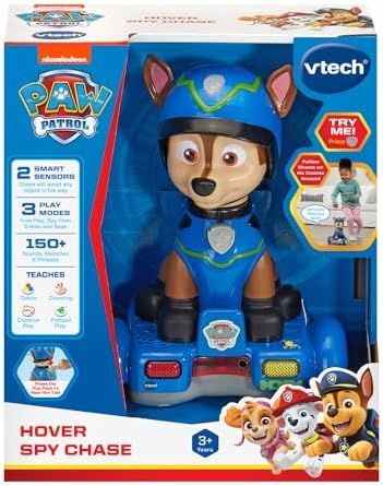 Spy Chase is on the case and can roll forward, backward and avoid obstacles while turning his head Play a game of I Spy and listen to Chase’s clues; press his pup tag or pup pack buttons to select what he’s seeing A spy is good at finding things; play hide and seek with Chase by closing your eyes and counting to 20 while he hides, then go find him Hear Chase call out to the PAW Patrol by pressing his pup tag and hear what tools he has by pressing the pup pack button Intended for ages 3+ years; requires 4 AA batteries; batteries included for demo purposes only; new batteries recommended for regular use › See more product details
