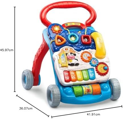 Removable Tray: The activity-packed, detachable panel is perfect for babies who can sit up; it can also re-attach to the walker for on-the-run fun on both carpet and bare floors Auditory Training: The activity center for baby boys and girls includes five piano keys that play musical notes and a telephone handset to encourage creativity and role-play fun Motor Development: 3 shape sorters, light-up buttons, and colorful spinning rollers are featured on the baby rolling walker to help define motor skills Balance Development: The toddler walker activity center helps the development of stability and movement skills as well as fine motor skills and hand-eye coordination Adjustable: Two-speed control switch on the walker allows growth along with your little one\'s changing speeds; the perfect baby walker for boys and girls alike