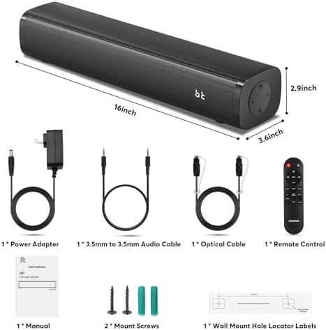 16-inch Ultra Slim Soundbar: This sound bar is compact, just 2.9\" tall for easy placement in front of your TV or mounted to a wall, perfect for small spaces.